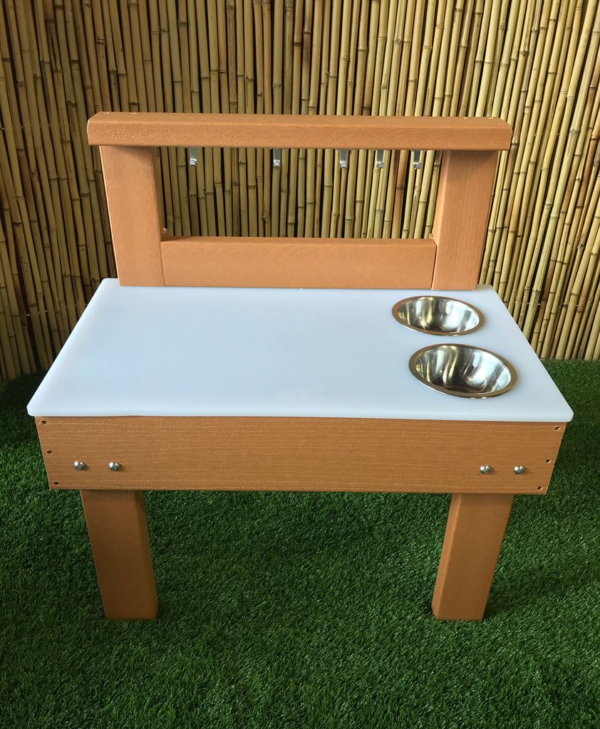 Introducing the new Kids' Station Indoor/Outdoor Toddler Mud Kitchen. This beautiful kitchen set includes all stainless steel fasteners to prevent rust. The recycled plastic composite frame and real cutting board table top are also impervious to the outside elements and will not fade or splinter over time. Just wash off for a crisp new appearance for many years to come. The two stainless steel sinks are removable. Measures 30" Wide x 18" Deep x 32" Tall with a table work surface of 20" tall. Note: This SKU does not include utensils. Avg Ship Time 2-4 Weeks